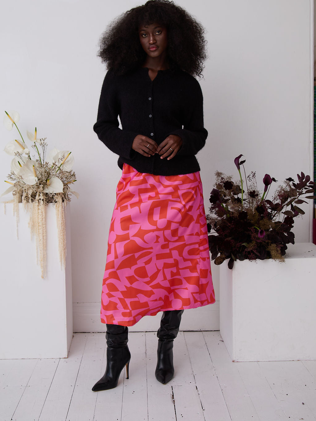 Introducing a fresh take on our bestselling satin skirt: the angel abstract print edition. Made from surplus fabric, this skirt features a refined A-line silhouette that complements all shapes and sizes. We've kept our signature elasticated waistband for a perfect blend of comfort and effortless style. With its vibrant red and pink abstract print, this skirt is the perfect addition to brighten up your wardrobe this season!