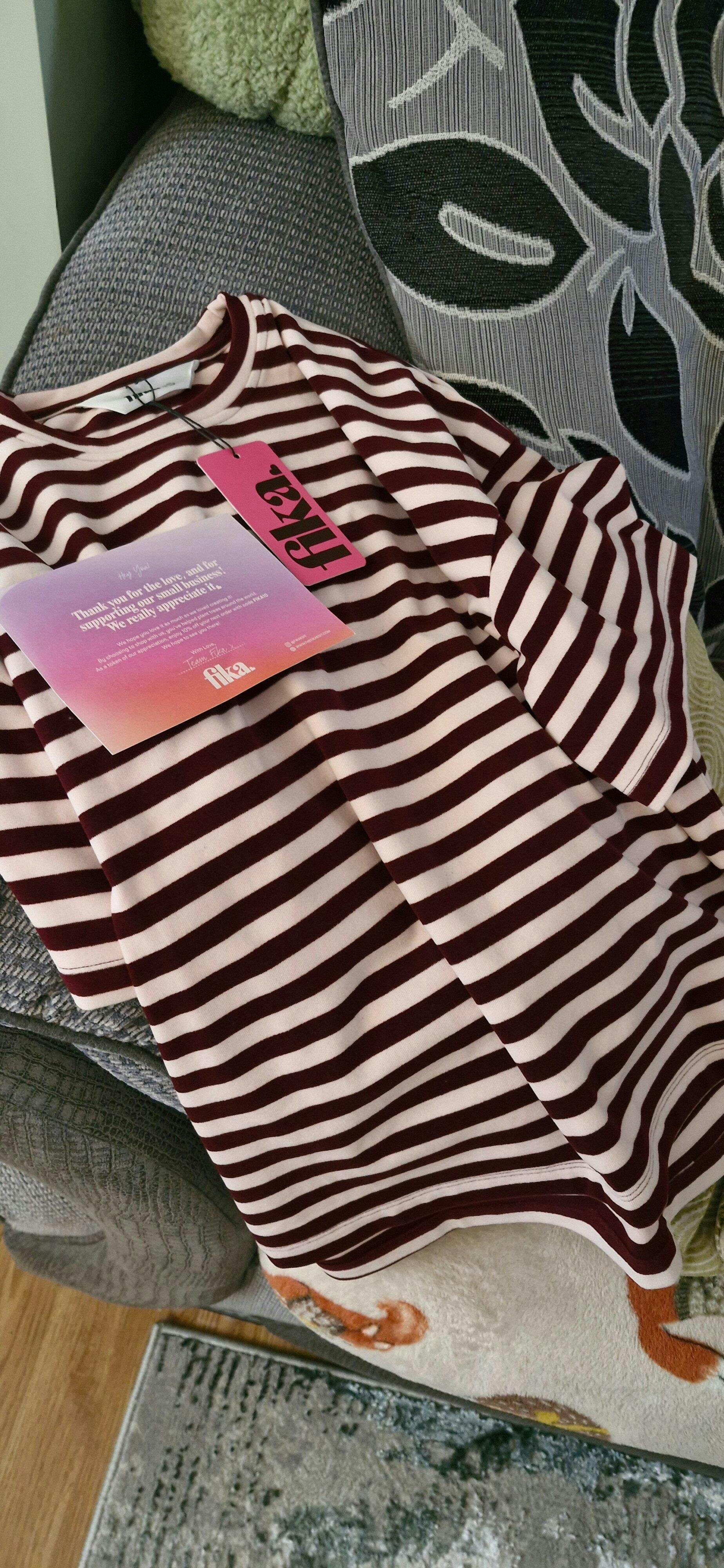 Our bestselling Sara Stripe A-Line T-Shirt is back! Now available in a beautiful brown and cream stripe. After multiple sell-outs, this slow fashion favourite returns in a fresh new shade, ready to become your most-worn piece for seasons to come.